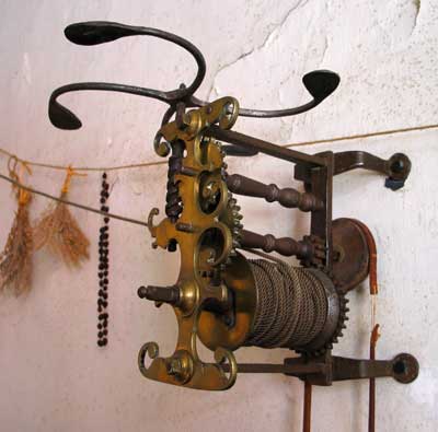 Clock jack This expensive kitchen tool from the 1700's would have been imported from England. Architectural evidence in the Deane house (a round wooden wheel in the outside wall) indicates that he would have had one in his kitchen for the convenience of his slaves. The clock jack works like a rotisserie in today’s super markets or the spit on a fancy barbecue in your backyard. Notice the rope that goes off to the left – a large stone is attached to the rope outside the house. If the rope is loosened, the stone begins to descend (like the weight of a tallcase clock, hence its name) which pulls a leather strap that is wrapped around a round metal wheel that is attached to a this metal bar where a small bird or other piece of meat has been skewered. The meat continually turns in front of the fire and cooks. It takes about twenty minutes for the outside stone to reach the ground, at which point a handle on the jack must be hand-turned to bring the stone up to start the process again. If a family did not have this tool, and most would not have been able to afford one, a child or mother would have had to continually stand in front of the uncomfortably hot fire turning the meat. Webb Deane Stevens Museum