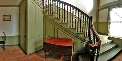 Entering through the door, the beautifully hand carved banister (see image) was intended to impress the guests right away. The wood is actually locally available cherry, which was stained dark to represent the more stylish preference for mahogany. This area is quite empty of furniture and was probably used as a greeting area for whoever was knocking at the front door. Silas's house was one of the few of his time that had a closet here in the front hall to hang wet and heavy cloaks in the winter months. The one print (see image), which is on the wall opposite the door, shows an area of Paris where Silas spent a great deal of time during his stay there in 1776 and '77. In this room the Webb-Deane-Stevens also has a copy of a British cartoon from 1783 (see image). You can study the cartoon in detail on the link. Yale University's Lewis Walpole Library in Farmington, Connecticut has provided the color print. Please take note that Silas Deane was considered in the same boat (or should we say basket) as George Washington at this point in history in England at least. |