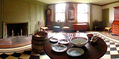 We can now move through the first floor of Mr. Deane's house and take a peak at another elegant parlor. Here, because it is so close to the magnificent kitchen you will soon see, we believe fancy dinners would have been served. Can you picture George Washington dining here on his way to Boston in 1775 to take command of the troops or John Adams also eating as he stopped by for a meal before the Revolution? The furniture and other items represent the lifestyle of a very wealthy and prominent family in the 1770s. You will notice that not all the furniture is for dining. It was most common in that time for rooms to have many purposes, not just the dining room or living room or TV/computer room we find in today's houses. Notice a desk where Silas could have been writing the many, many letters, which must have kept him so busy. (In the Documents section of this website you can read some of the letters Silas wrote throughout his life.) |